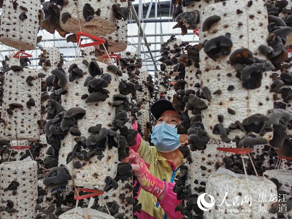 工人在延軍農場有限公司木耳產業基地採摘木耳。袁成亮 攝
