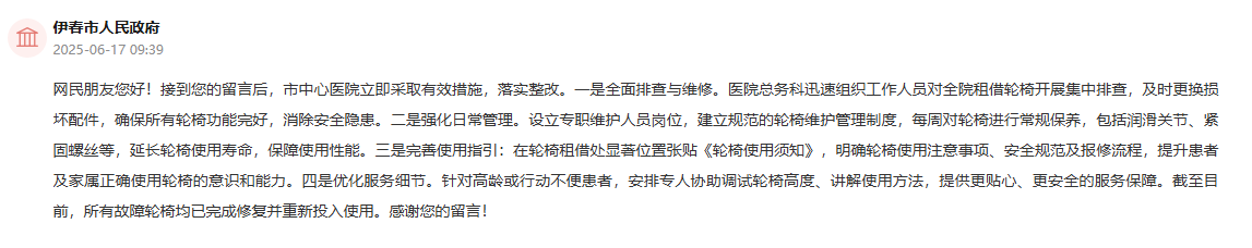 收到留言后,伊春市中心醫院立即採取有效措施,落實整改。一是全面排查與維修。醫院總務科迅速組織工作人員對全院租借輪椅開展集中排查,及時更換損壞配件,確保所有輪椅功能完好,消除安全隱患。二是強化日常管理。設立專職維護人員崗位,建立規范的輪椅維護管理制度,每周對輪椅進行常規保養,包括潤滑關節、緊固螺絲等,延長輪椅使用壽命,保障使用性能。三是完善使用指引:在輪椅租借處顯著位置張貼《輪椅使用須知》,明確輪椅使用注意事項、安全規范及報修流程,提升患者及家屬正確使用輪椅的意識和能力。四是優化服務細節。針對高齡或行動不便患者,安排專人協助調試輪椅高度、講解使用方法,提供更貼心、更安全的服務保障。截至目前,所有故障輪椅均已完成修復並重新投入使用。