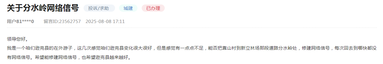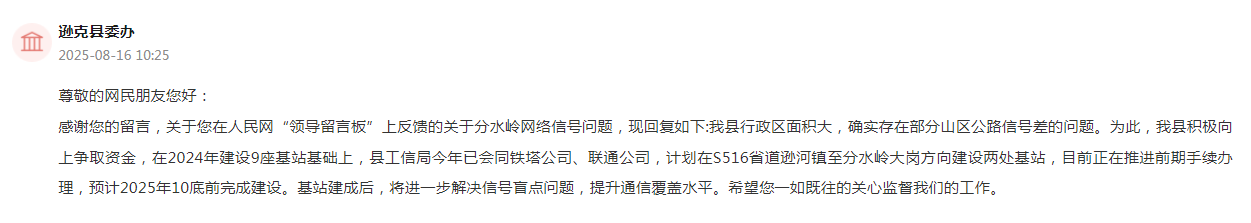 針對網民反映的問題,遜克縣委辦回復稱,遜克縣行政區面積大,確實存在部分山區公路信號差的問題。為此,該縣積極向上爭取資金,在2024年建設9座基站基礎上,縣工信局今年已會同鐵塔公司、聯通公司,計劃在S516省道遜河鎮至分水嶺大崗方向建設兩處基站,目前正在推進前期手續辦理,預計2025年10月底前完成建設。基站建成后,將進一步解決信號盲點問題,提升通信覆蓋水平。