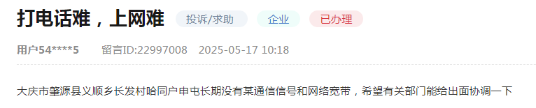 有網民留言反映稱,大慶市肇源縣義順鄉長發村哈同戶申屯長期沒有通信信號和網絡寬帶,出現打電話難、上網難等問題。