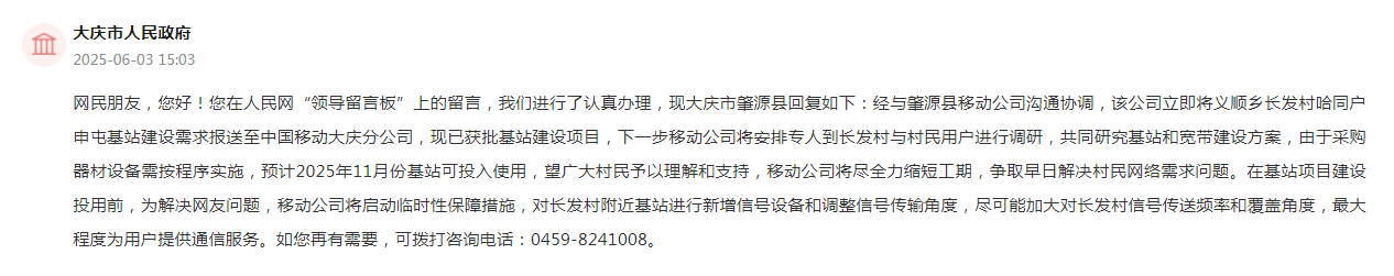 大慶市人民政府收到網民訴求后進行了認真辦理,經與肇源縣移動公司溝通協調,該公司立即將義順鄉長發村哈同戶申屯基站建設需求報送至中國移動大慶分公司,現已獲批基站建設項目。下一步,移動公司將安排專人到長發村與村民用戶進行調研,共同研究基站和寬帶建設方案,由於採購器材設備需按程序實施,預計2025年11月份基站可投入使用。