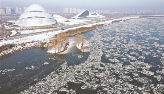 15日,松花江哈尔滨城区段,部分江面开始封冻。冻结的江面光亮如镜,傍晚,沿江的诸多地标建筑倒映其中,静美如诗。(记者 张澍 摄)