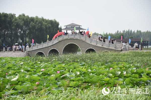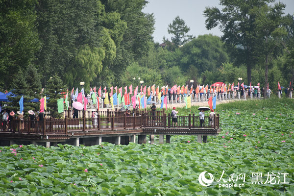 人民网哈尔滨7月28日电 (杨雪楠、王泽宇)7月28日,第二十六届方正莲花节开幕式在方正县举行,市民和游客齐聚方正湖公园,一览千亩莲花盛开的美景。