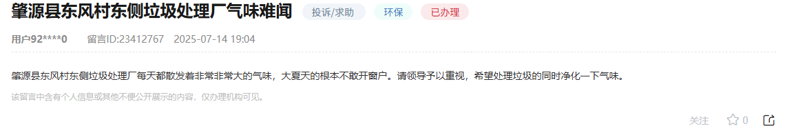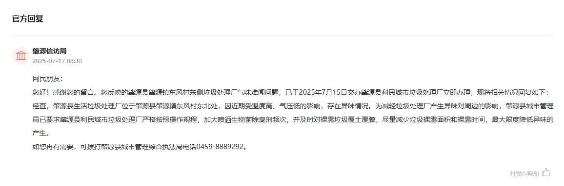 肇源县信访局积极办理了该条留言。据回复,经查,肇源县生活垃圾处理厂位于肇源县肇源镇东风村东北处,近期受温度高、气压低的影响,存在异味情况。为减轻垃圾处理厂产生异味对周边的影响,肇源县城市管理局已要求肇源县利民城市垃圾处理厂严格按照操作规程,加大喷洒生物菌除臭剂频次,并及时对裸露垃圾覆土覆膜,尽量减少垃圾裸露面积和裸露时间,最大限度降低异味的产生。