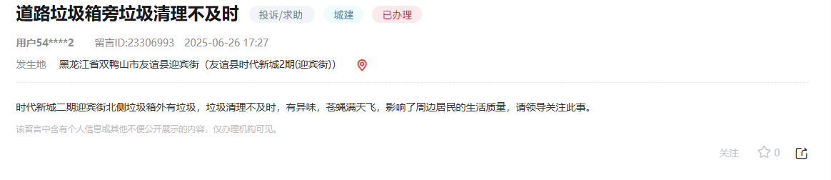 友谊县网民也遇到了“垃圾清理不及时,有异味”的情况。网民在留言中表示:“时代新城二期迎宾街北侧垃圾箱外有垃圾,垃圾清理不及时,有异味,苍蝇满天飞,影响周边居民的生活。”