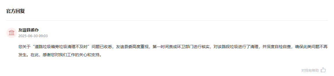收到该条留言后,友谊县委第一时间责成环卫部门进行核实,对该路段垃圾进行了清理,并深度自检自查,确保此类问题不再发生。