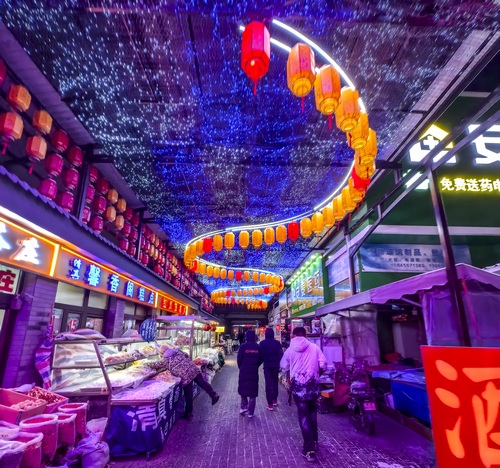 整条街上方搭配着满天星幕布和近700盏灯笼,科技感与节日的氛围感十足。市场内150家商户统一更换了仿古牌匾,置身市场,让游客感受到穿越般的新鲜体验,不少市民及游客纷纷掏出手机“打卡”拍照。(闫明明、宋燕军)