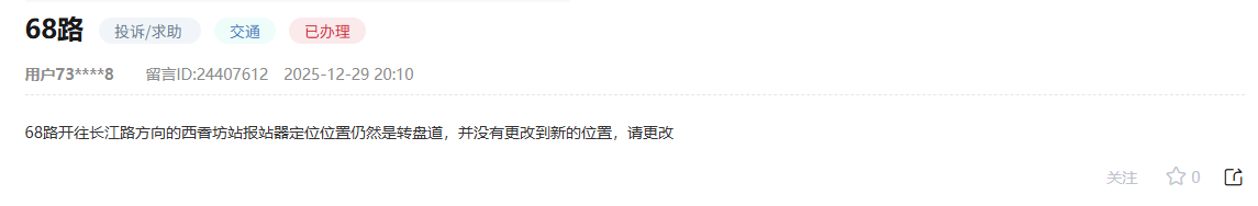 网民留言称,开往长江路方向的68路公交车西香坊站报站器定位位置仍然是转盘道,并没有更改到新的位置。