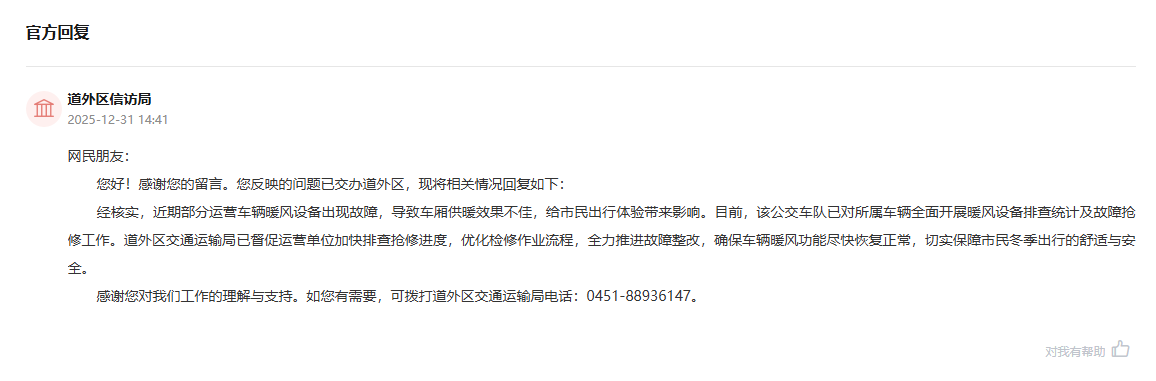 道外区信访局核实了该条留言,近期部分运营车辆暖风设备出现故障,导致车厢供暖效果不佳,给市民出行体验带来影响。公交车队已对所属车辆全面开展暖风设备排查统计及故障抢修工作。道外区交通运输局已督促运营单位加快排查抢修进度,优化检修作业流程,全力推进故障整改,确保车辆暖风功能尽快恢复正常。