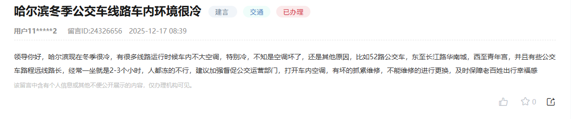 网民留言表示,哈尔滨冬季很冷,部分公交线路运行时车内不开空调,特别冷。有些公交车运营路程长,经常一坐就是2-3个小时。建议加强督促公交运营部门,打开车内空调。