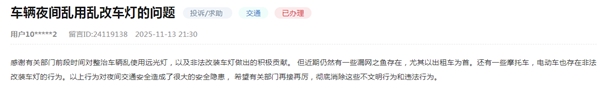 长期以来,机动车滥用远光灯等不合理使用灯光的行为,持续影响着道路交通安全。有鹤岗市网民留言称,有关部门前段时间对整治车辆乱使用远光灯以及非法改装车灯作出了积极贡献,但近期仍然有一些漏网之鱼存在,尤其以出租车为首,还有一些摩托车、电动车也存在非法改装车灯的行为。以上行为对夜间交通安全造成了很大的隐患,希望有关部门再接再厉,彻底消除这些不文明行为和违法行为。