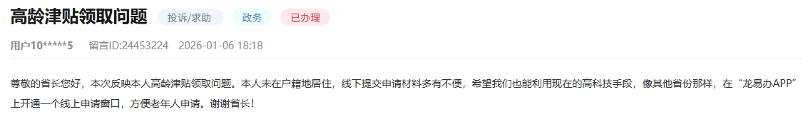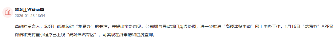黑龙江省营商局对该留言进行了办理,经前期与民政部门沟通协调,进一步推进“高龄津贴申请”网上申办工作,1月16日,“龙易办”APP及微信和支付宝小程序已上线“高龄津贴专区”,可实现在线申请和进度查询。