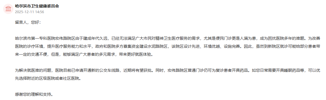 哈尔滨市卫生健康委员会针对该网民的留言进行了回复,哈尔滨市第一专科医院宏伟路院区由于建成年代久远,已经无法满足广大市民对精神卫生医疗服务的需求,尤其是便民门诊更是人满为患,成为困扰医院多年的难题。为改善医院的诊疗环境,提升医疗服务能力和水平,政府和医院多方募集资金建设水泥路院区,该院区设计先进、环境优越、设施完善。因此,虽然到新院区就诊可能给部分患者带来一定的交通不便,但是,能够满足广大患者的多元需求,带来更好就医体验。