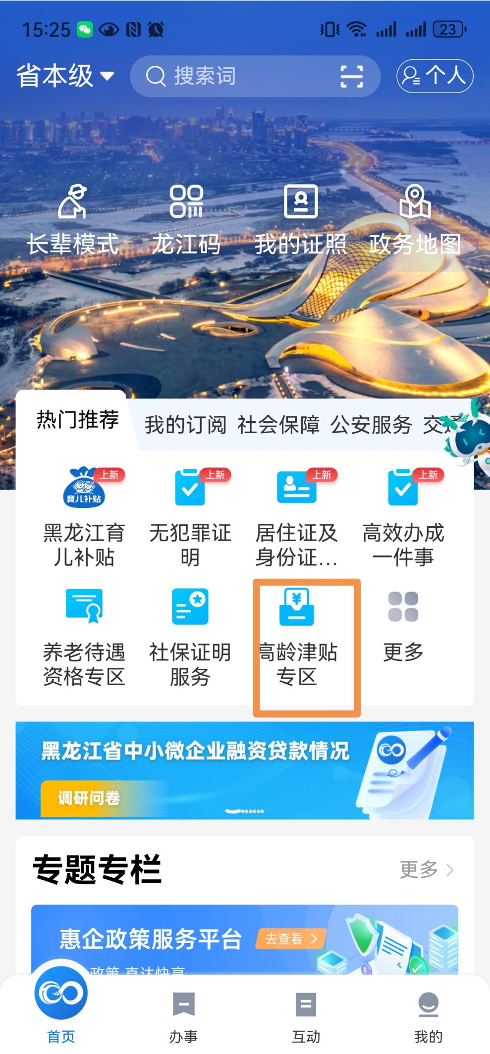 据悉,“龙易办”是黑龙江省政务服务移动端总入口,基于企业群众生产生活需求,纵向贯通省市乡村五级,横向拉通公安、人社、医保、公积金、市监、税务等高频领域,推进政务服务事项实现“掌上办”“指尖办”。此次上线“高龄津贴专区”,将进一步提升养老服务效能,为群众办事增添便利。
